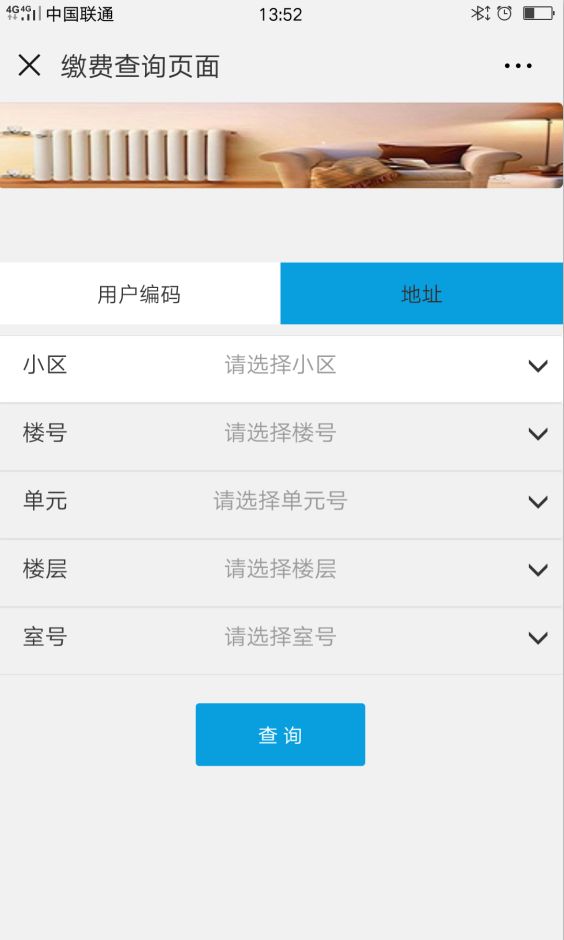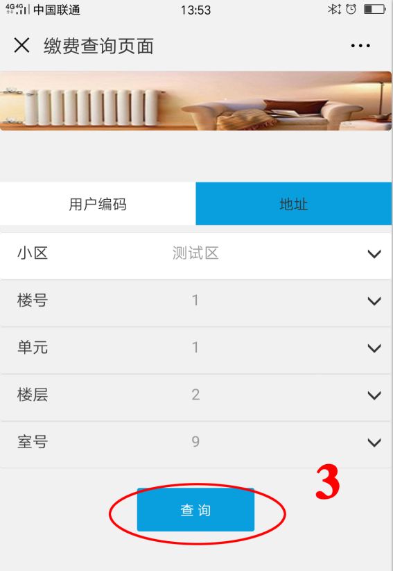 點擊地址選項卡,然后填寫小區(qū)、樓號、單元號、樓層、室號,然后點查詢