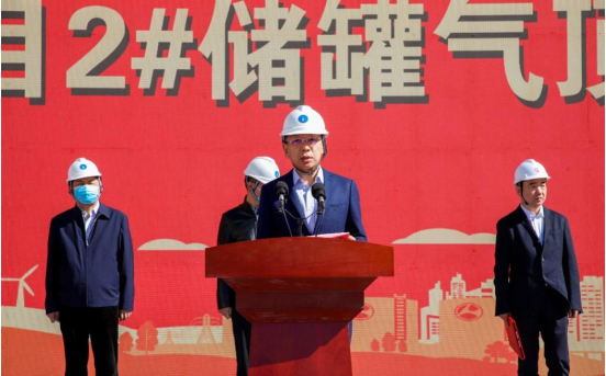 曹妃甸區(qū)政府黨組成員、副區(qū)長王劍致辭 曹妃甸區(qū)政府黨組成員、副區(qū)長王劍對與會嘉賓表示歡迎并對項目一線工作者致以慰問。他指出,唐山LNG項目作為國家能源發(fā)展規(guī)劃中的重要一環(huán),對優(yōu)化京津冀地區(qū)能源結(jié)構(gòu)、滿足區(qū)域天然氣供需平衡要求、助力打贏“藍(lán)天保衛(wèi)戰(zhàn)”具有深遠(yuǎn)意義,將為河北省乃至京津冀地區(qū)帶來顯著的經(jīng)濟(jì)和社會效益?!氨敬?#儲罐氣頂升是儲罐建設(shè)過程中的關(guān)鍵工序之一,是唐山LNG項目建設(shè)中的標(biāo)志性事件。曹妃甸區(qū)委區(qū)政府將牢固樹立服務(wù)意識,打造優(yōu)質(zhì)營商環(huán)境,全力支持項目后期建設(shè)及運(yùn)營,預(yù)祝項目早日建成投產(chǎn)。”