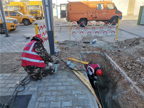 演練首先模擬在一廠區(qū)內(nèi),一家管線單位在未進行地下資源勘查、未實施施工情況告知和審批的情況下,擅自采用機械開挖方式施工,造成主干道下燃氣管破損,雖然未造成燃氣大量泄漏,但管道受損部位情況不明。情況發(fā)生后,現(xiàn)場施工人員迅速跑出事故區(qū)域,并通知燃氣公司。應(yīng)急人員迅速趕到現(xiàn)場實地查看分析,為保障居民正常用氣,最終確定實施不停氣搶修作業(yè),按照燃氣事故應(yīng)急處置預(yù)案,對周邊區(qū)域設(shè)置警戒、壓力控制、搶險搶修等一系列應(yīng)急措施。最后,在各部門的通力協(xié)作下,在未停氣的情況下完成搶修作業(yè),最終順利完成任務(wù)。